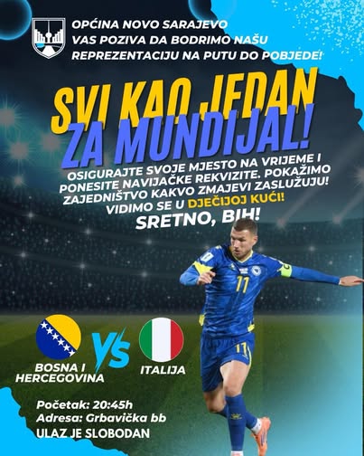 – Večeras ne gledamo utakmicu – večeras dišemo kao jedno! Općina Novo Sarajevo vas poziva u fan zonu, gdje zajedno bodrimo naše Zmajeve na putu ka pobjedi! Pokažimo snagu zajedništva, energiju i srce koje kuca za Bosnu i Hercegovinu – poručila je Karić.